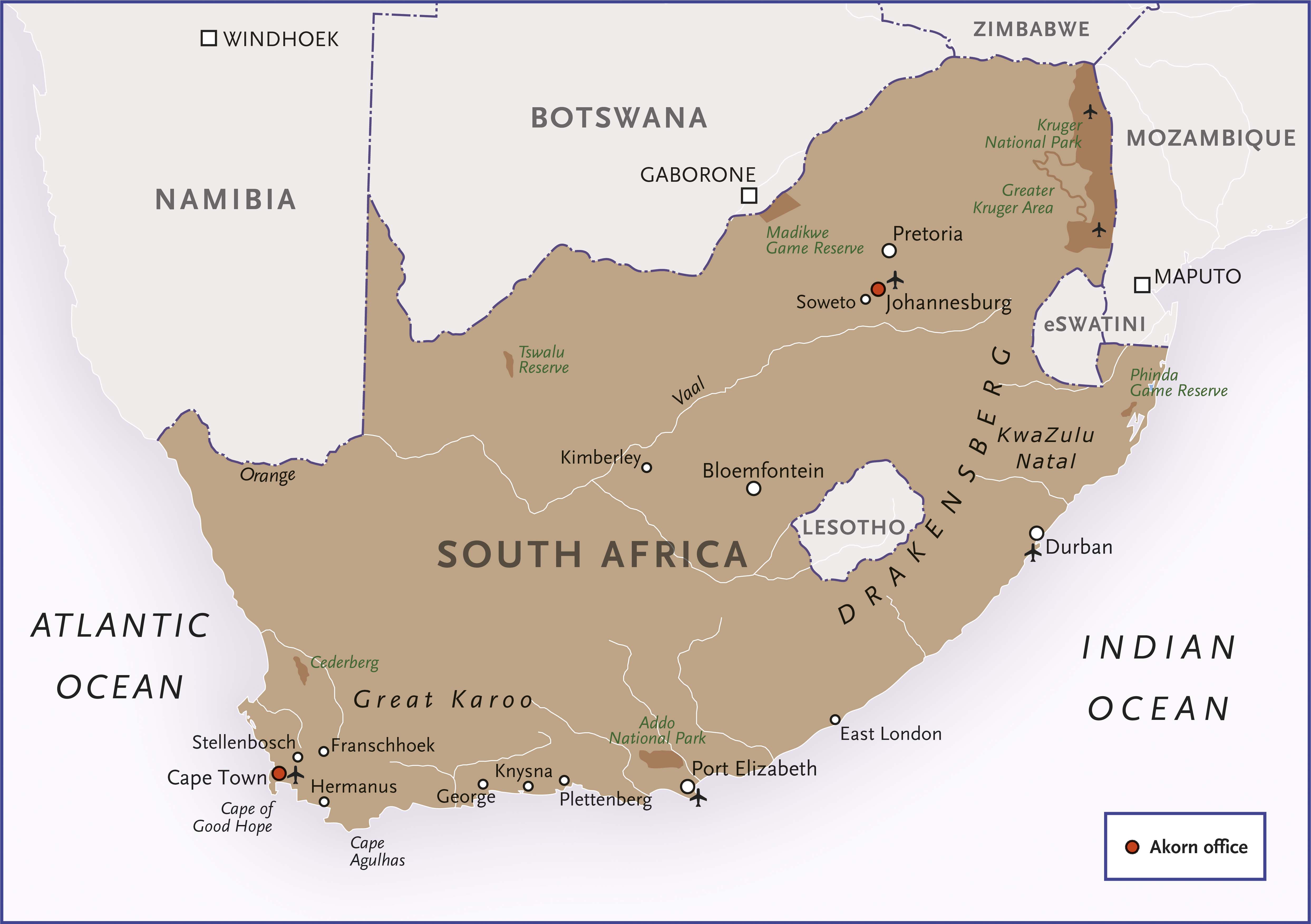 South Africa is a region of incredible diversity in landscape, wildlife and culture. Experience deserts, savannah, forests, coral reefs, endless beaches, mountains, modern cities, epic scenery and prolific wildlife. The people of South Africa are made up of many diverse cultures and hence it is known as the "Rainbow Nation" with eleven official languages. There is nowhere better to view the "Big Five" than Southern Africa's luxurious private reserves, where guests travel in open four-wheel-drive vehicles, allowing for unobstructed views of wildlife. Lion, leopard, buffalo, elephant and rhino can all be found and with highly skilled rangers who know just where to look. Bird life is prolific and for the sheer variety of flora, only the Amazon rivals the density of all species found here. In the Cape region, Mediterranean in climate and European in culture, you will find ample opportunities for day cruises, nature hikes, wine tasting and simply soaking up the spectacular view.