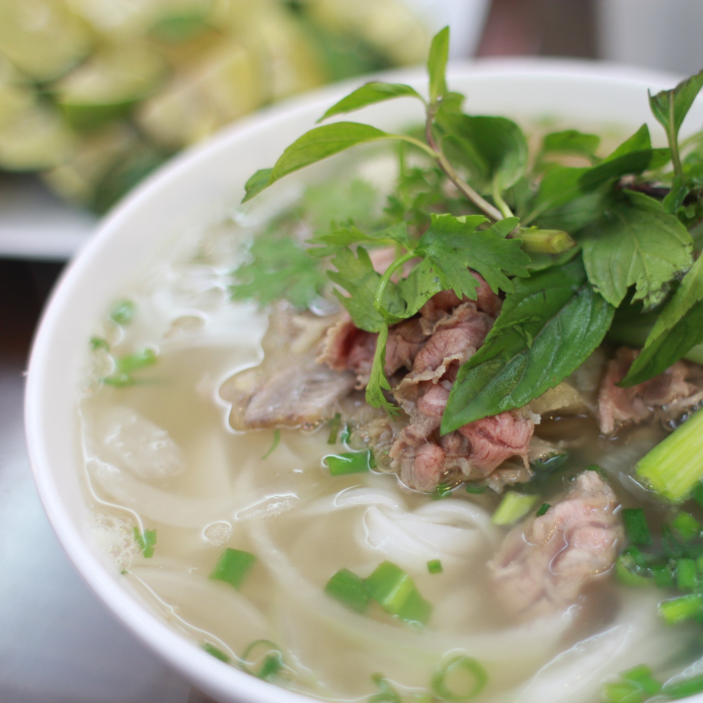 Of course, no list of Vietnamese food is complete without pho (pronounced "fer”). Rice noodles typically served with a steaming, aromatic broth and thinly sliced rare beef that cooks in the bowl before your eyes. Although Hanoi is credited as the birthplace of this dish, we prefer the southern Vietnamese version which is served with a variety of garnishes and condiments such as hoisin sauce, Thai basil, lime, green onions and cilantro.