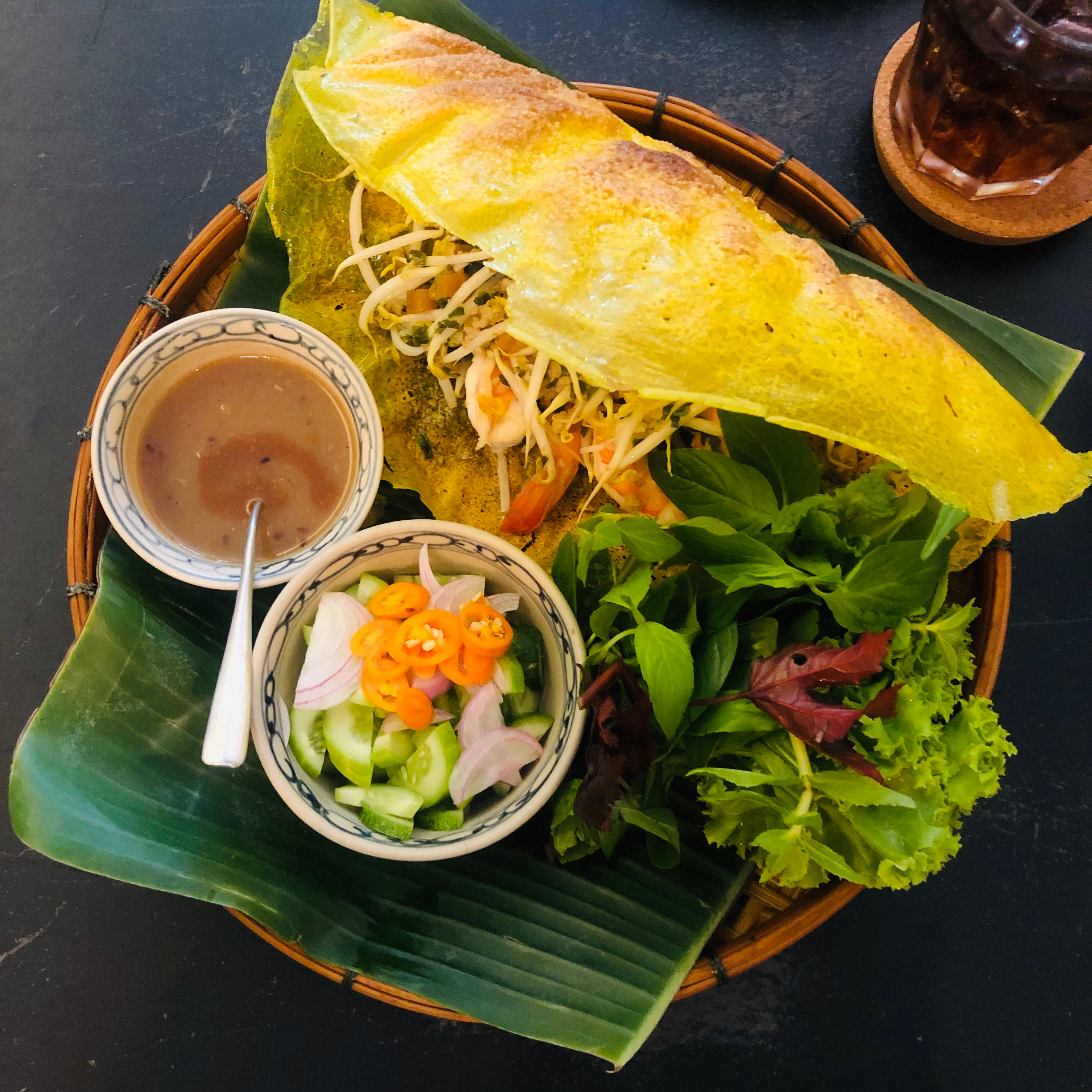 Part crispy and part chewy – a good banh xeo delivers an irresistible combination of textures and flavors. This type of “sizzling cake” originated in central Vietnam but is now available across the country with each kitchen delivering its own slightly different version with different fillings and condiments. Our favorite is a hot night spot in Ho Chi Minh City where the batter of rice flour, water and turmeric is poured into a hot skillet, fried until crisp and stuffed with meats, green onions, mung beans and bean sprouts. Delicious!