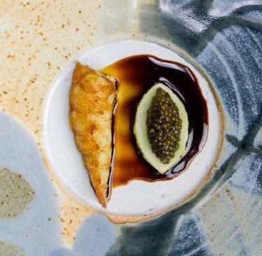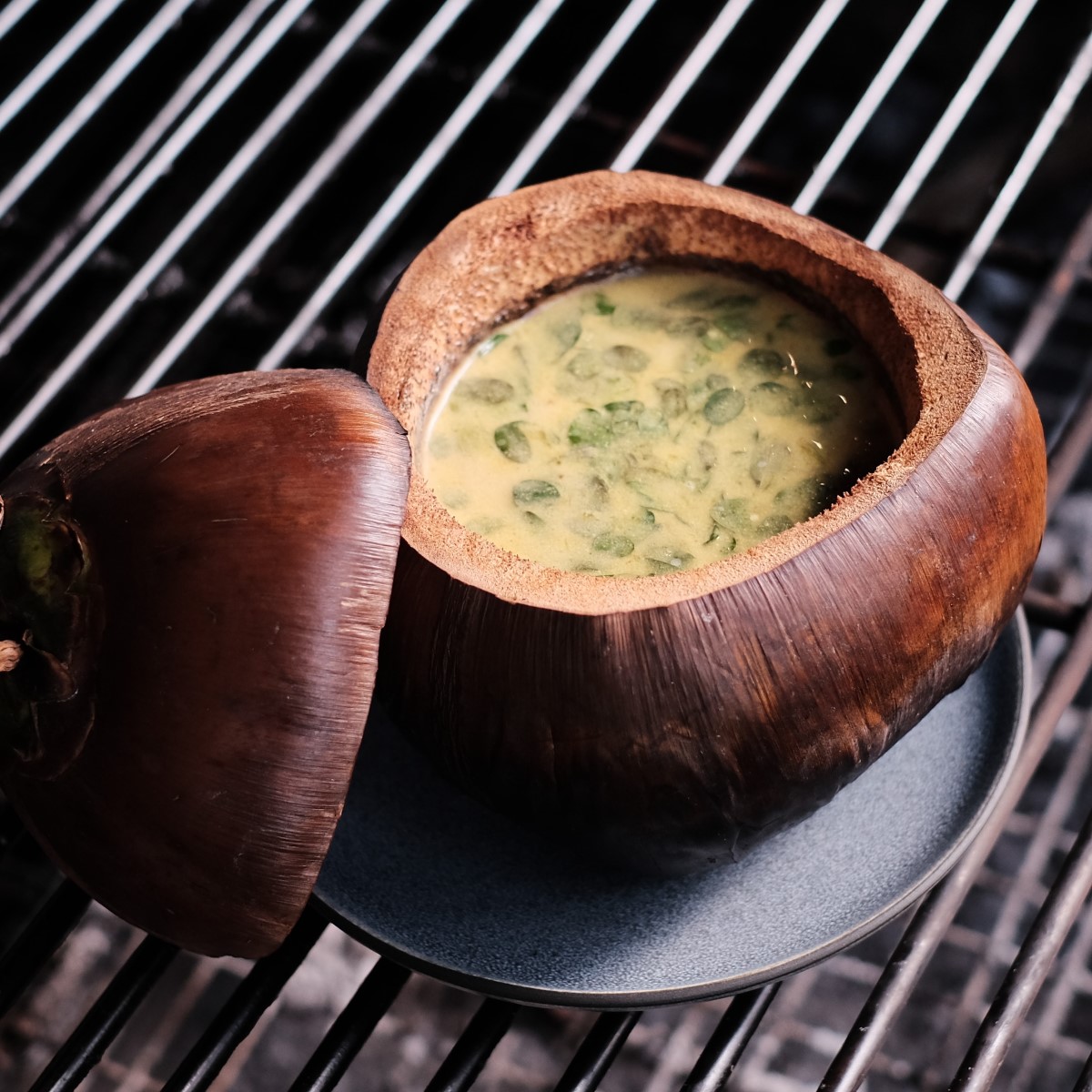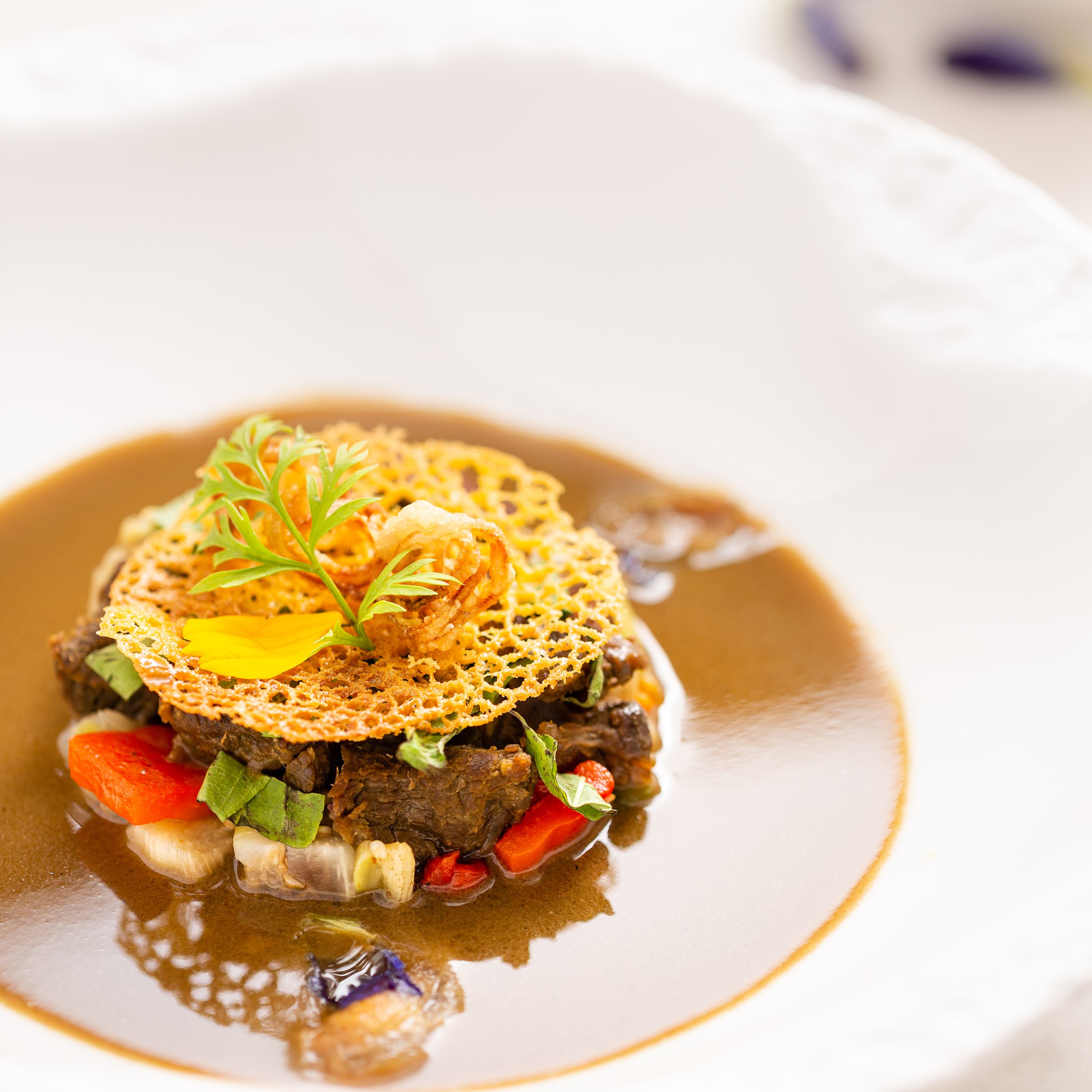 Twin sisters, Kimsan Pol and Kimsan Sok, the pioneering female chefs who define Khmer gastronomy, love the traditional local flavors of krueng thpeal ko. Slow cooked Wagyu beef cheek in lightly yellow curry spiced stock, the dish is served with fresh coconut milk, burned lucida fruit and smoked eggplant.